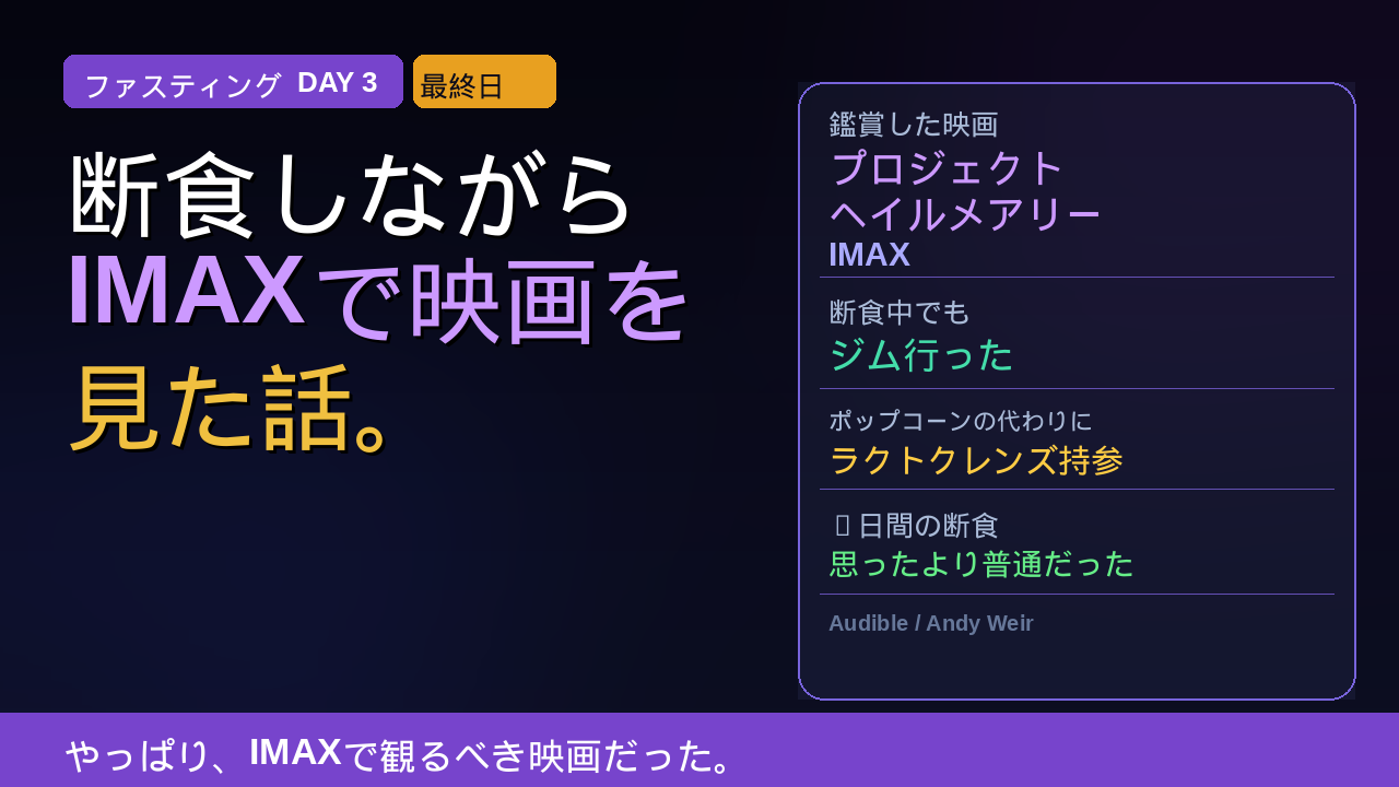 映画館もジムも行けた。仕事も普通にできた。「断食=寝込む」というイメージがあったが、実際はそうではなかった。これが一番の発見かもしれない。